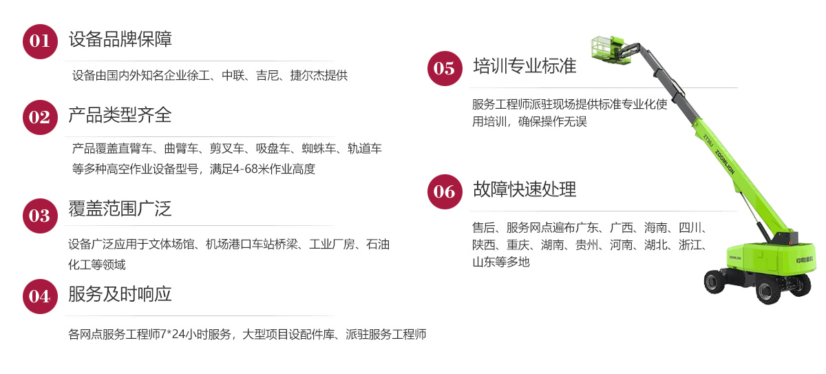 公司產(chǎn)品系列齊全,品種豐富,覆蓋了剪叉式、直臂式、曲臂式、蜘蛛式及吸盤式等多型號(hào)高空作業(yè)車,滿足4至68米各種工作高度的施工要求。設(shè)備廣泛用于工程建設(shè)、文體場(chǎng)館、廠房搭建,施工維護(hù),幕墻裝飾、工程裝修、消防工程、市政工程、電力、通訊、高空管路鋪設(shè)、高架橋梁的建造、涂裝及各種大型工礦企業(yè)等場(chǎng)所。設(shè)備移動(dòng)靈活,安全穩(wěn)定,能有效提高施工效率,降低工人勞動(dòng)強(qiáng)度,縮短施工時(shí)間,節(jié)省施工成本,是高效安全施工的理想選擇。